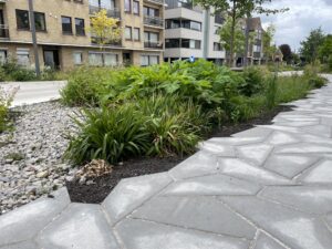 Dans le sol tourbeux de Gouda, la construction de routes est difficile : les fondations lourdes s’enfoncent rapidement dans le sol meuble. Aquaflow a développé une alternative légère pour sa propre fondation de route retenant l’eau : Aquaflow Argimedes. La construction se compose d’unités en plastique robustes avec des connexions intégrées pour les puisards WT et l’eau de pluie. Les unités sont couplées et enveloppées de géotextile, créant ainsi une couche légère de répartition des contraintes qui peut également stocker l’eau. Avec une fine couche de granulats mélangés au-dessus, la fondation convient à un trafic intense. Cette solution est utilisée à la nouvelle gare routière et à la zone de recharge pour bus électriques de Qbuzz sur la